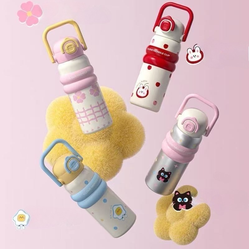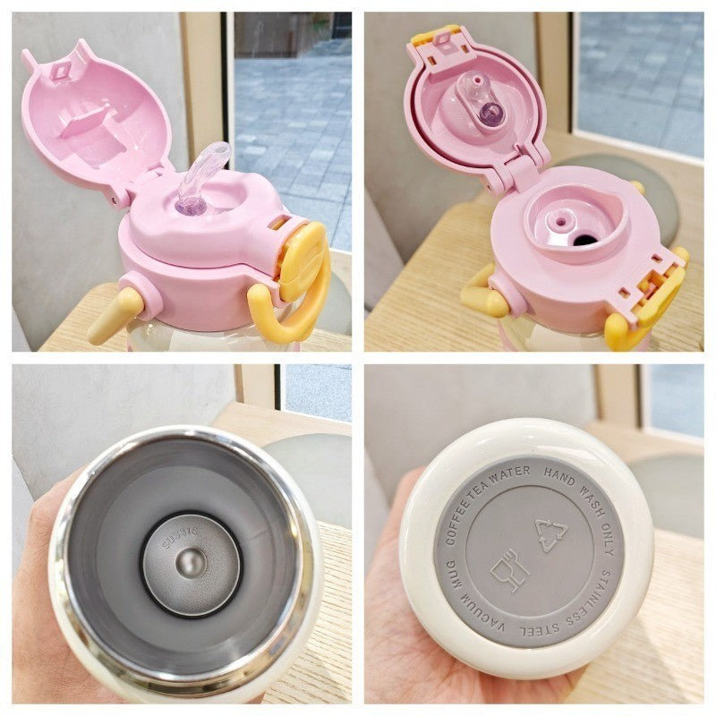 600ml ถ้วยฉนวนสแตนเลส ถ้วยกาแฟสไตล์การ์ตูน การออกแบบฝาสปริง หลอดดื่มตรง ซิลิโคนจับ