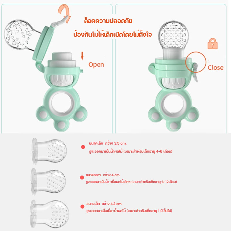 Silicone pacifiers for fruits and vegetables help develop a child's ability to learn to eat independently. They also soothe teething discomfort by allowing the child to hold, suck, and eat the food.