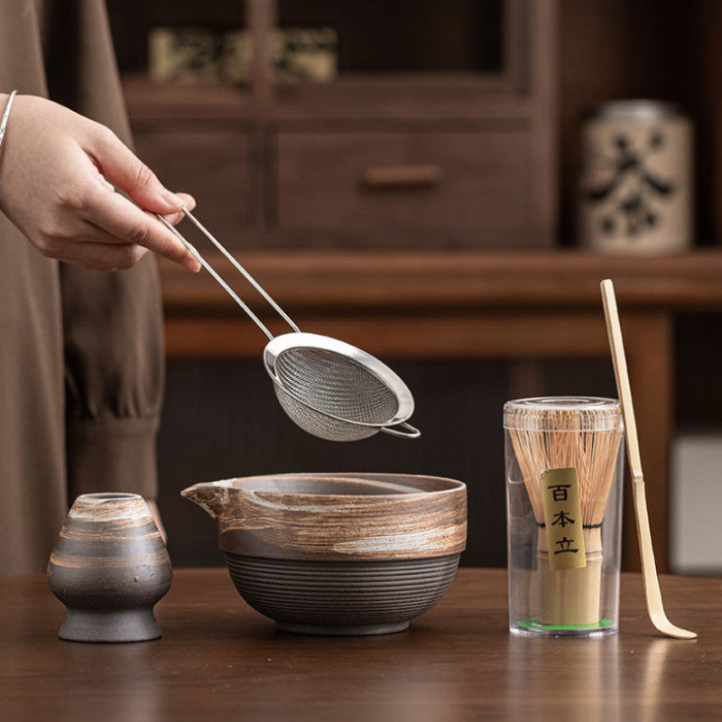 5. **ชุดครบเซ็ต**: ชุดชงชาเขียวมัทฉะ 5 ชิ้นนี้ประกอบด้วยถ้วยชาเขียวมัทฉะ ที่ตีชา ช้อนชา เข็มชา และที่กรองชา ครบครันทุกความต้องการสำหรับพิธีชงชาเขียวมัทฉะ