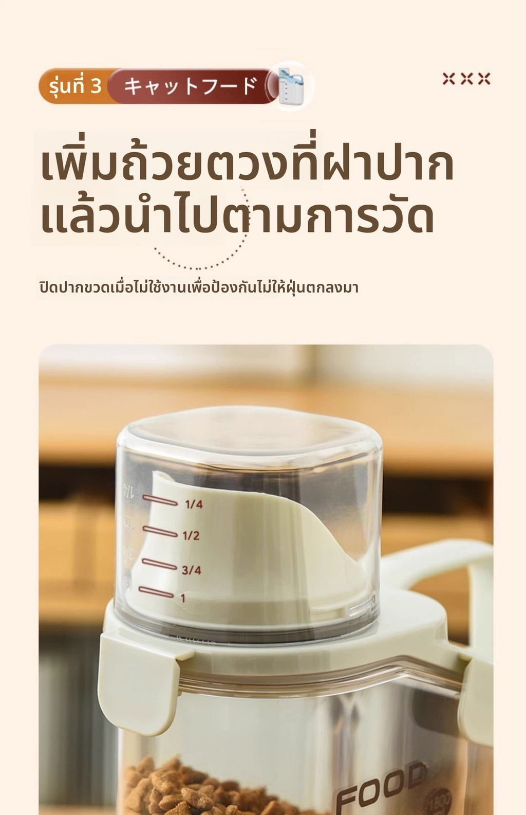 • 配有内置量杯,使用方便。盖子也可用于量取食物,并带有刻度标记。